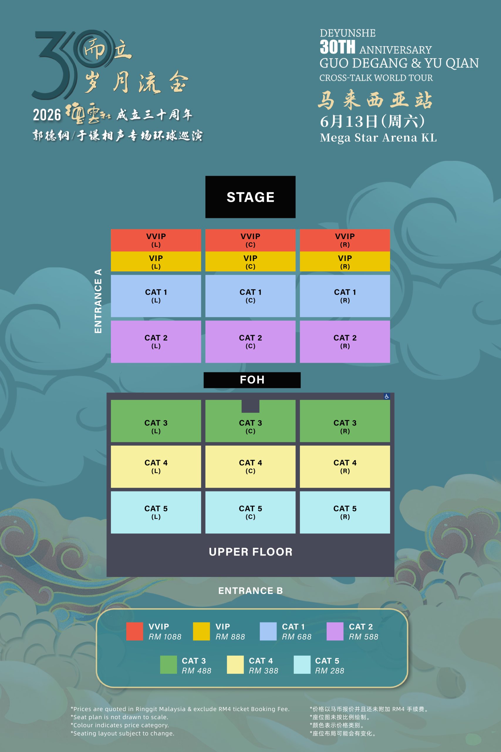 演出票价:VVIP – RM 1088 | VIP : RM888 | CAT 1 : RM688 | CAT 2 : RM588 | CAT 3 : RM488 | CAT 4: RM388 | CAT 5: RM288 ( exclude ticket Booking Fee)